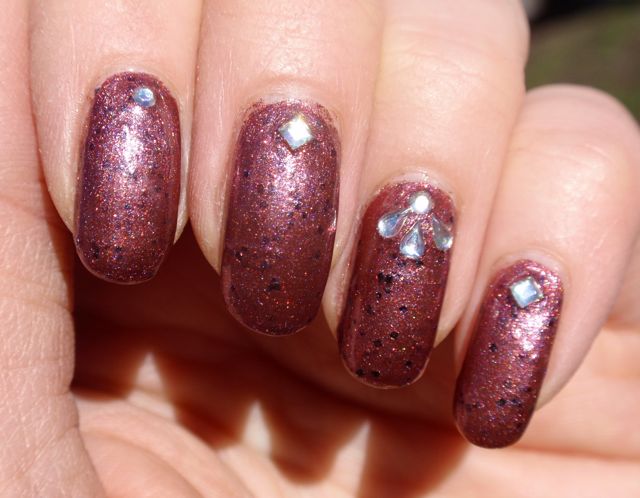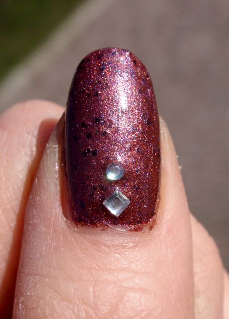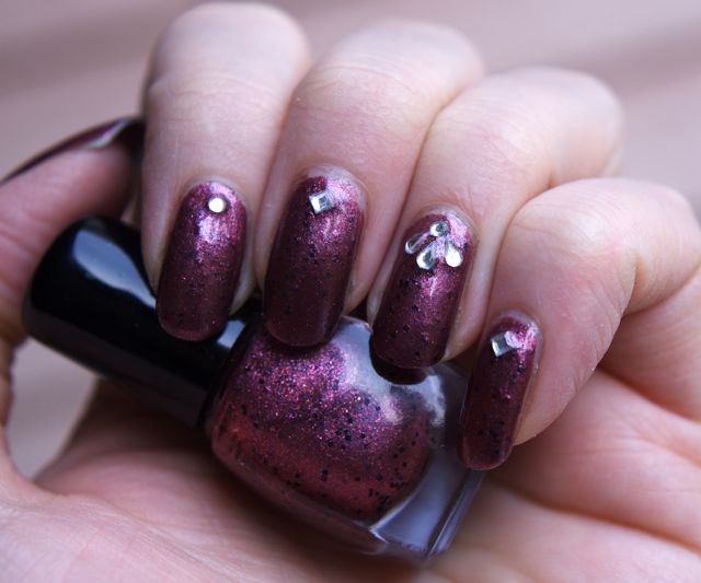 I’ll continue showing some of my franken experiments. This is the sixth polish I made, and I’m not that fond of it. I don’t know why, really, it just didn’t appeal to me. I don’t remember exactly what I used, but I do remember using at least purple pigment, red shimmer and small, black glitters. Possibly other pigments as well. It was a little rough but opaque in two coats. I have actually given what was left of it to Lina at Make It Fab. We work in the same place and she liked it so I thought it was better if it came to someone who appreciated it more.