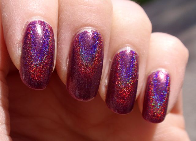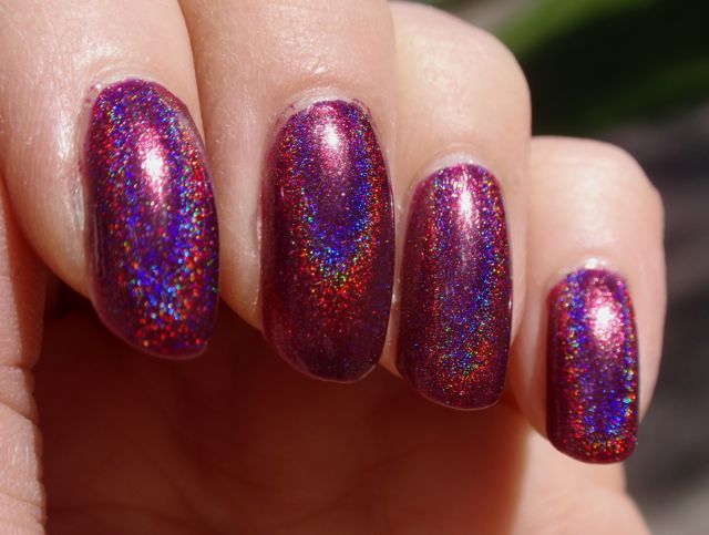 Haha, jag kan vara med på holofredag den här veckan! Holosuget har slagit till nu när solen kommit fram på allvar, så det kommer säkert att bli fler hololack på mina tassar framöver. Just det här köpte jag i min jakt efter ett blåtonat rött holo, men när det kom så insåg jag att det egentligen snarare är rödlila. Sak samma, det är jätteläckert, så jag är nöjd ändå! (Fast kommer att fortsätta leta efter det perfekta, mättade blåtonade röda holot.) Jag kommer faktiskt inte ihåg om jag hade två eller tre lager av det, men det var i alla fall rätt trevligt att lacka med, vill jag minnas. Det har som sagt en väldigt fin rödlila färg och maffiga regnbågar.