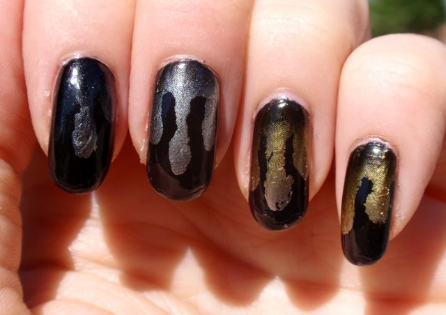 Veckans bidrag till Nail Art Sunday blir en foliemanikyr. För ett tag sedan fick jag hem en folie som skiftar i en gradient mellan svart, silver och grått. Jag målade ett försök till regndroppar med folielimmet (det är inte så lättkontrollerat, så de blev lite klumpiga) över två lager av det svarta A-England Camelot och fäste sedan de delarna av folien som var mest silvriga eller guldiga på den. Toppade med två lager Picture Polish Revolution som överlack för att inte skrynkla folien. Det här såg bättre ut på lite håll, så här i närbild ser man tydligare att det blev lite ojämnt.