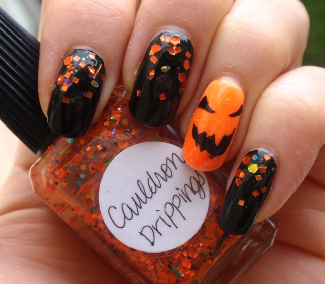 I’m cranking up my Halloween manicures little by little and the second was considerably less discreet than the last one. I used the classic Halloween colour combination of black and orange and I quite love the result. I used two coats of the black creme A-England Camelot as a base on most fingers and added a glitter gradient with Lynnderella Cauldron Drippings (an old Halloween favourite). I think that Cauldron Drippings actually looked much better like this than on its own.