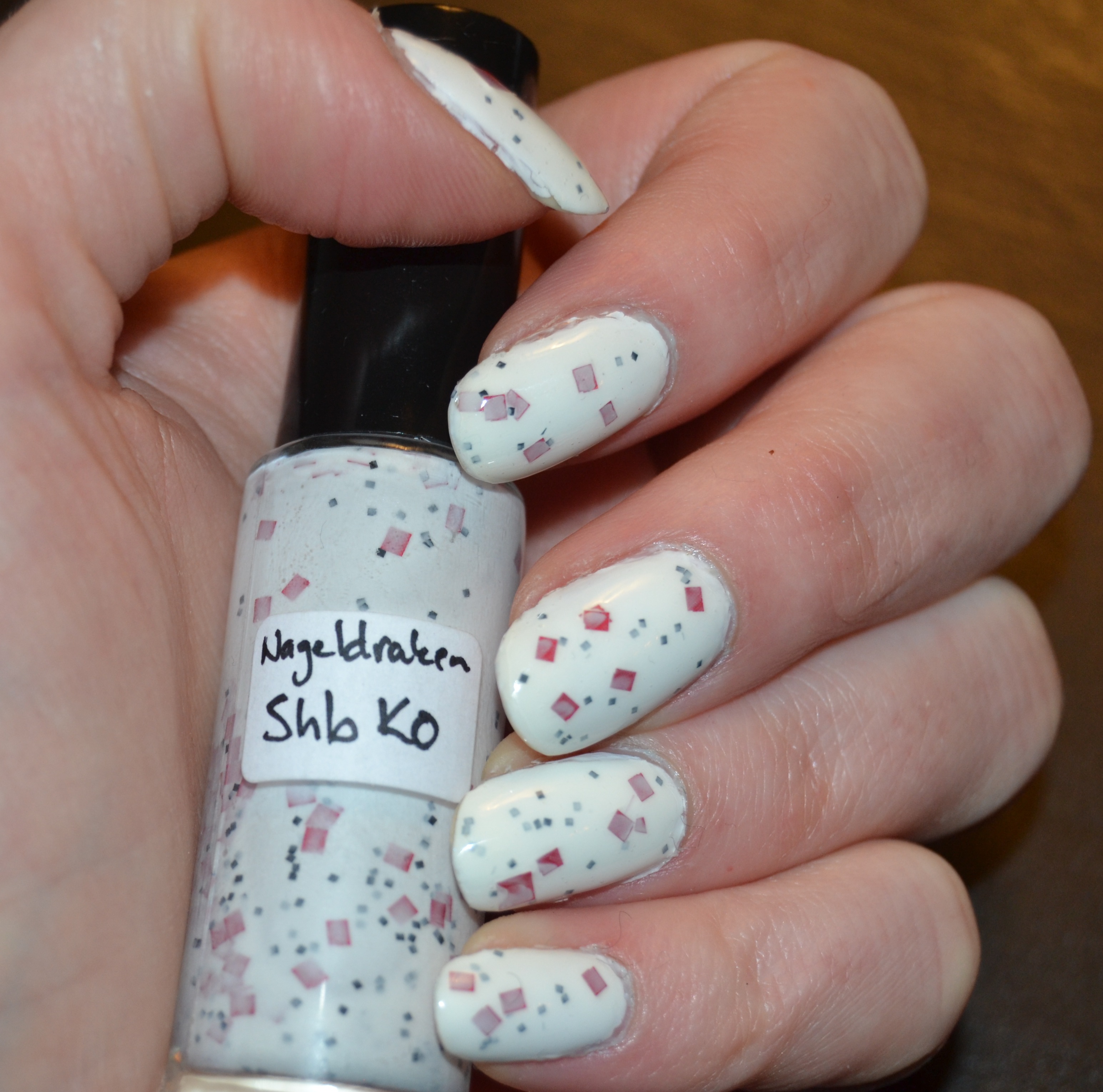 Shb KO är alltså ett av lacken från den kollektionen. Namnet syftar på det protein jag ägnade 5 år av mitt liv åt och det matchar därför avhandlingens omslag (se bild nedan!). Det är en skir vit bas med små svarta glitter och stora röda fyrkanter. Eftersom basen är så pass tunn måste man ha ett annat, mer täckande lack som bas så här bär jag ett lager Shb KO över ett vitt krämlack från Sally Hansen.