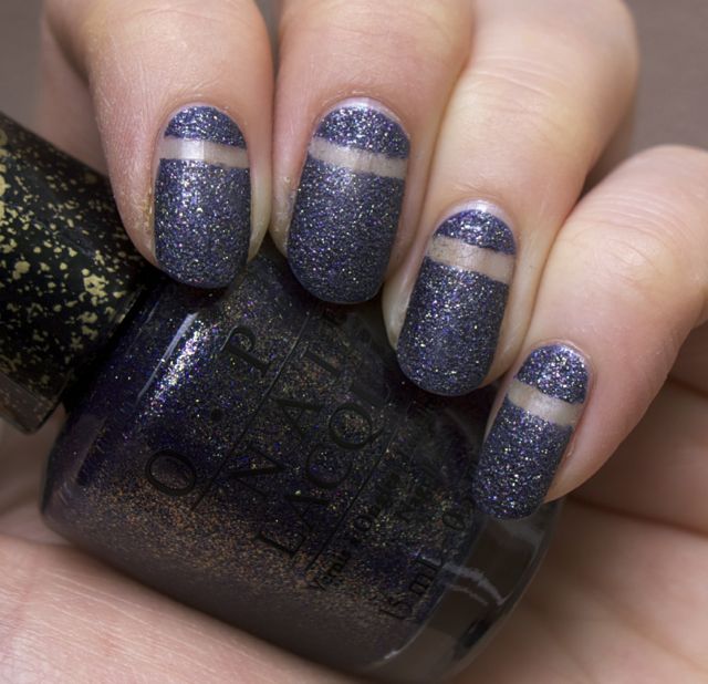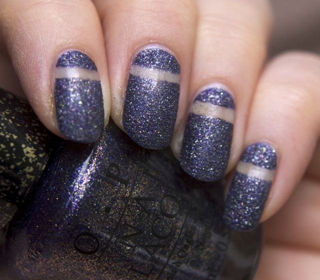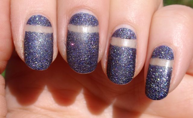 Briefly: One thick coat of OPI Alcatraz… Rocks. Dark bluish purple (or purplish blue) with multicoloured glitter. Excellent application and dried pretty quickly. Did a negative space-mani with it using nail vinyls from Twinkled T.