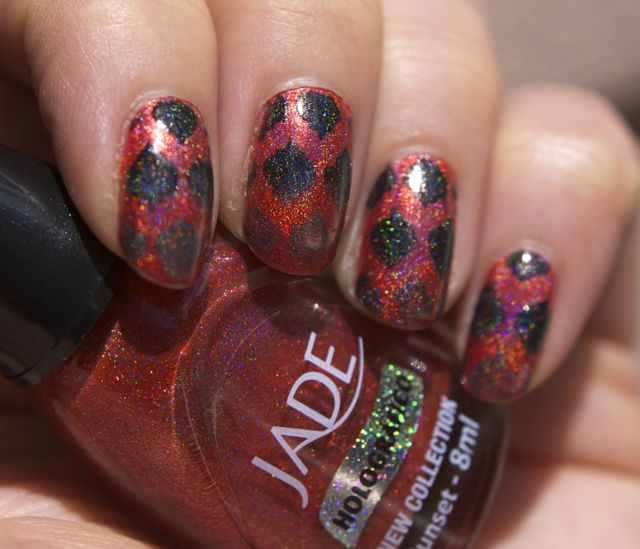 The polish is an orange holo that leans pink. It is ok, but not really my cup of tea (too pink, I guess ;-)). The rainbows were nice, though, and it applied in three easy coats.