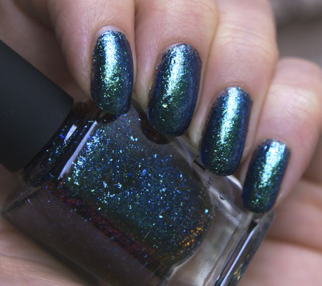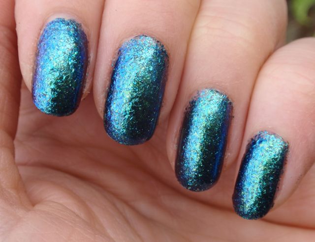Det är ett väldigt tjusigt multikromatiskt flakie som skiftar från teal till blått till lila. Jag bar tre lager. Det här var mitt första försök att svampa på ett glitterlack, och det blev sådär, vilket ni kan se på att det blev lite kladdigt vid nagelbanden. Jag gick över till att måla som vanligt istället. Det berodde nog på att jag inte lät lacket sjunka in i svampen några sekunder innan jag duttade på det, har jag insett i efterhand, samt att jag inte hade min latexbarriär (i det här fallet Liquid Palisade, nu har jag gått över till Simply Peel) så att det verkligen täckte nagelbanden. Numera tycker jag det funkar rätt bra att svampa på glitterlack.