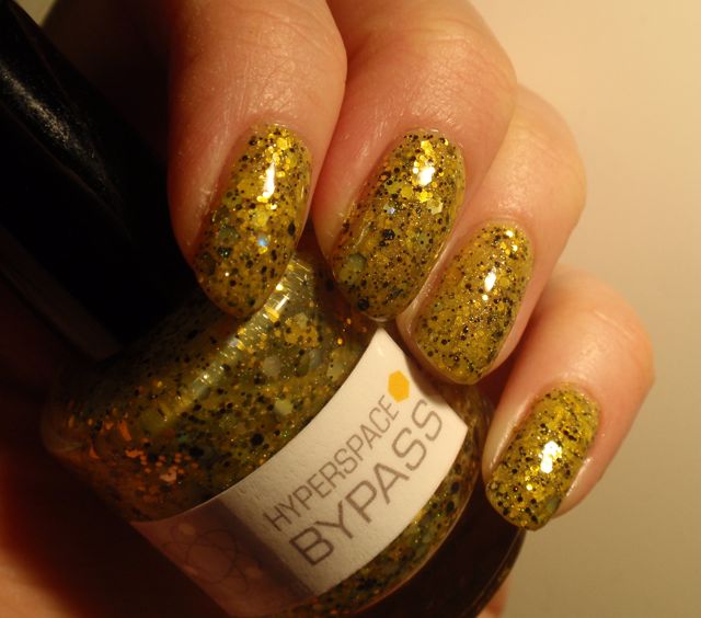 Collier själv beskriver det sålunda: Hyperspace Bypass  is a massively glittering big yellow something that hovers on your fingertips in exactly the way that bricks don’t. Packed with pale gold glitter, medium and large golden hex glitter, and small and medium black glitter, plus a sprinkling of holographic hex sparkles, it’ll disintegrate every other polish in your collection.