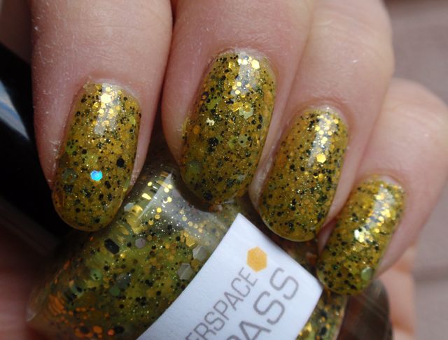 Collier herself describes it like this: Hyperspace Bypass  is a massively glittering big yellow something that hovers on your fingertips in exactly the way that bricks don’t. Packed with pale gold glitter, medium and large golden hex glitter, and small and medium black glitter, plus a sprinkling of holographic hex sparkles, it’ll disintegrate every other polish in your collection.
