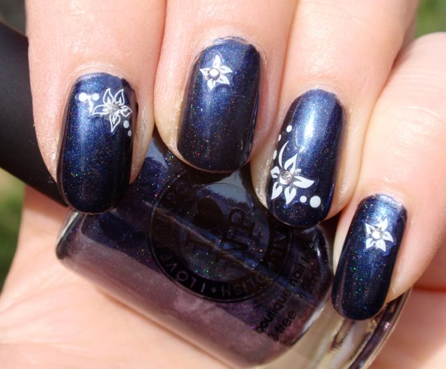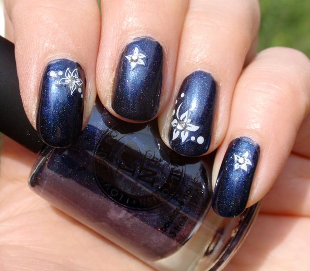 ILNP gör många spektakulära, jätteläckra lack, men det här är inte ett av dem. Det är mörkblått med en liten, liten aning holo, men knappt så det syns. Det täckte på två lager och var ganska lättlackat, men det hjälps inte – det här får inte mitt hjärta att slå snabbare, även om det är helt ok. Dekalerna är från Nailshop och är fina, men inte heller de är spektakulära. Det här är väl lite av en mellanmanikyr, helt enkelt.