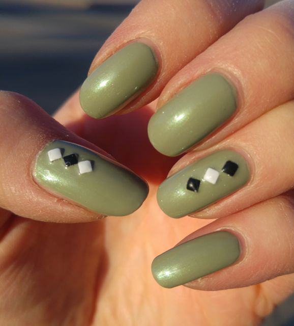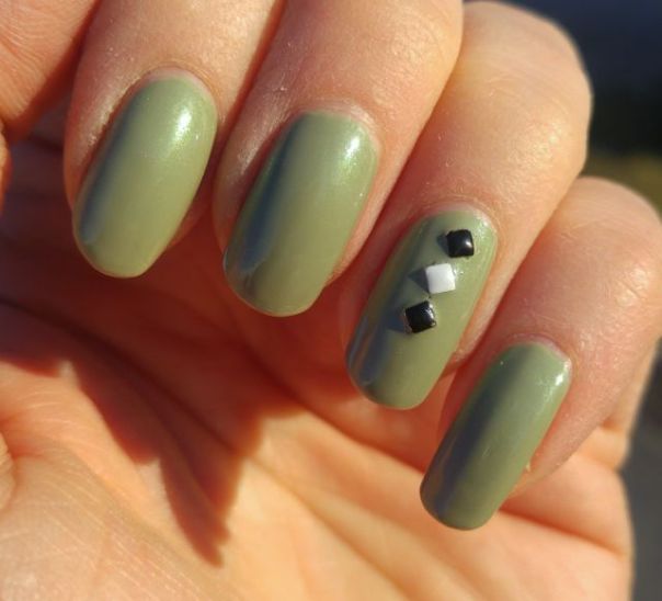 In English: There is a lot of pink in the spring collections, but this nice light army green polish was included in the Depend Game, Set, Match collection, and I quite like it. It has a very discreet green shimmer, that sadly is only visible in direct sunlight. It is more visible in the bottle. As usual with Depend it was opaque in two coats and applied flawlessly. I decorated it with black and white studs that I have bought from Edgy Polish‘s final sale.