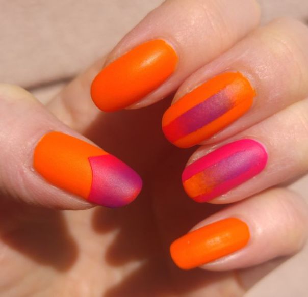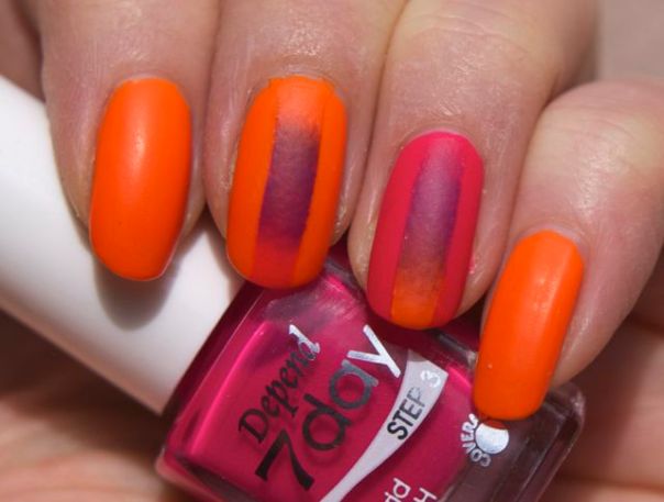 Neonerna torkar till en matt finish som jag tycker är väldigt snygg. På pek- och lillfingret ser ni hur det ser ut ett dygn efter lackning. Naglarna som jag dekorerade fick också ett lager matt överlack, som också är från Depend, för att jämna ut ytan.