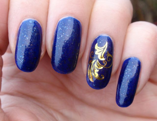 Vackert! Guld och mörkblått är en hit och flakesen i lacket ger det hela ett extra umph!