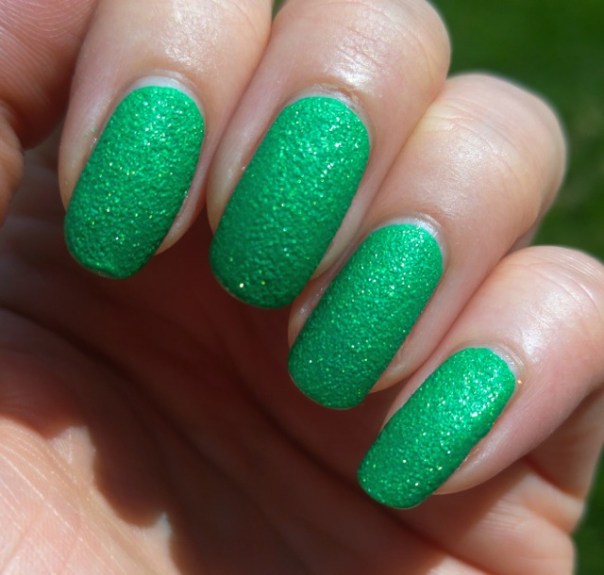 Nu är det semester och jag har tid och ork att blogga igen, så idag passar jag på att vara med på Karins gröna onsdag! Det här lacket bar jag för några veckor sedan, och det är ett sånt där som har hamnat längst bak bland de otestade och stått bortglömt alldeles för länge. Synd, för det är riktigt fint! Det är härligt knalligt gräsgrönt strukturlack som har ett fint guldskimmer, som dock var svårt att fånga på bild. (Det syntes bättre med överlack.) Det täckte väldigt bra, nästan på ett lager, men jag bar två bara för att få det jämt. Jag bar det först utan överlack, men klämde på överlack efter ett par dagar för att få lite omväxling.