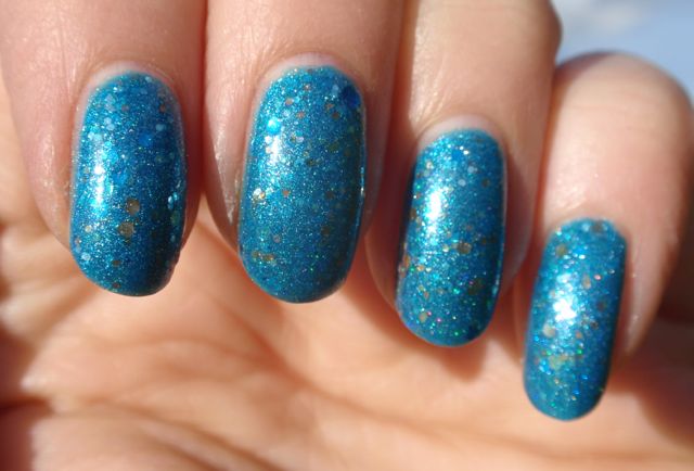 In English: Now that it is possible to buy old nerds again (you can do it here), it feels better to show the ones that don’t belong to the regular line any more. Antisocial Media is very old, but also very pretty. Blue with glitters in gold and bright blue, and some holo dust. I don’t remember how it was to apply, but I guess it took two-three coats and was nice to use – most nerds are.