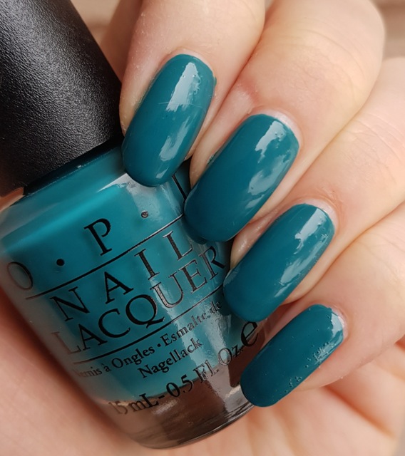 OPI Is That a Spear in Your Pocket? kommer från förra årets vår/sommarkollektion Fiji och är ett riktigt fint grönturkost krämlack. Jag trivdes bra i det och hade funderingar på att dekorera det, men hann inte så långt eftersom det började chippa så smått redan efter ett dygn. Men det var fint på egen hand också.