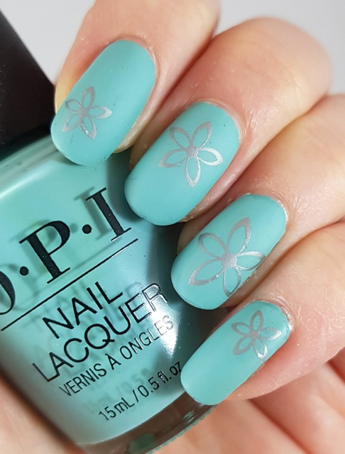 Dekoren blev väldigt diskret – enkla vattendekaler med gråsilvriga blommor från Milv (köpta från She Sells Seashells, som tyvärr just har lagt ner sin webshop). De syns knappt på lite håll, men jag är ganska nöjd med det eftersom jag just nu inte är sugen på iögonfallande nail art. Jag la på ett matt överlack från Depend efter ett dygn, och jag tycker det blev riktigt snyggt. Dekalerna syntes lite mer, och hela manikyren blev lite mjuk i stilen.