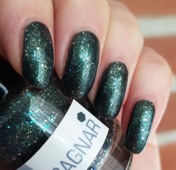 Nerdlacquer Ragnar är ett härligt höstmurrigt grågrönt lack med med glitter i silver och klarare grönt. Det kändes helt rätt för årstiden när jag bar det för någon vecka sedan. Visserligen tycker jag inte att det är så noga med anpassa färgskalorna efter årstiden, men jag har ändå en tendens att vara mer sugen på mörka, murriga färger på höstkanten.