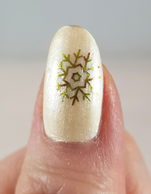 I have actually not shown you my Christmas Eve manicure yet. The base is OPI Snow Glad I Met You, that I have gotten as a press sample from the Love, OPI Christmas collection 2017. I have not worn it myself before now, but I did use it for a friend’s wedding manicure last autumn. (That manicure is still in the archive, I’m afraid.) It is a beautyful white polish in a warm tone with pink and gold shimmer. White can be a bit difficult to wear, but this I think this is very pretty and much more wearable than stark white cremes. The only con is that it is very sheer. I wore it over the white base coat OPI Put a Coat On! (also a press sample), but I still needed three coats. And it was still a bit uneven!