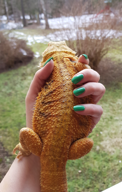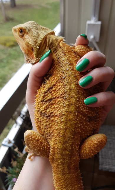 In English: I’m continuing with the ”posing with lizard” theme. 🙂 This bright pastel green was very pretty against my yellow little Smaug and he’s still small enough to fit in my hand. Since it was a relatively warm day, we posed on the balcony so he could look around a bit too.