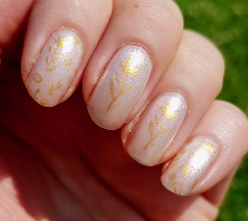 Jag ville piffa till det lite och stämplade med guldstämplingslack från Born Pretty Store och plattan 5-02 från ÜberChic Beauty, vilket dock knappt syntes IRL. Jag hade nog behövt ett mörkare guldlack för att det skulle synas mer.