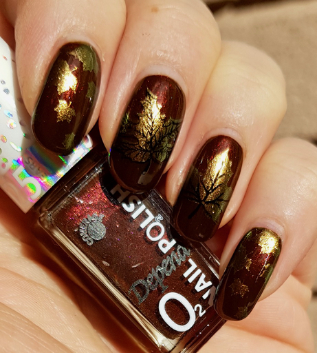 For the stamping I used the Lina Nail Art plate Autumn 03 and a duochrome stamping polish from Born Pretty Store, Leo (BPU01). It shifts between gold and green, but the shift is quite discreet and it mostly looks golden. The veins were stamped with a black stamping polish, also from Born Pretty Store. It was a bit tricky to match the veins with the leaf, but it looked good from a distance!
