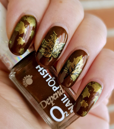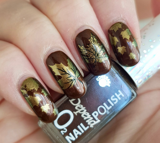 In English: Apart from Halloween manicures, the autumn also gives us the opportunity to do autumn manis, which is almost as good as Halloween manis! Here I used a reddish brown shimmer that was sent to me as a press sample from the Depend Recycle collection, one of this year’s autumn collections. It is a really nice polish that applied well and was opaque in two coats.