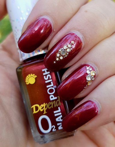 Jag lovade att visa ett lack som fortfarande går att köpa, så här kommer ett från en av Depends höstkollektioner. Det här är nummer 603 från Recyclekollektionen och jag har fått det som pressprov. Det är ett fint höstrött skimmerlack. Jag tyckte inte det var så jättespeciellt, men fick ändå väldigt många komplimanger från mina studenter för just de här naglarna. Dekoren var också mycket enkel – bara några dekaler från Kiss som jag klämde dit. Men i o f s – ibland är det enkla inte så dumt!