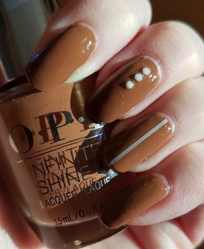 In English: After the slightly messy red Christmas mani, I was in the mood for a simpler manicure and ended up with a minimalistic gingerbread inspired manicure. I dug through my untried polishes for the most gingerbready brown and chose OPI Brains & Bronze, a press sample from when the Infinite Shine series was launched in 2016. The colour is not that exciting on its own, but I liked this manicure quite a lot. It is quite odd that I did, especially since Brains & Bronze is very similar to Ice-burgers & Fries from the Nordic collection in 2014, which I didn’t like at all when I wore it.