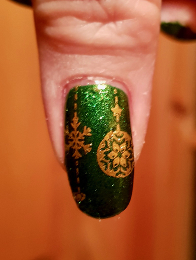 But enough about that, more talk of the mani! The polish is actually quite old. I bought it in 2014 and have shown it before, but it is such a perfect Christmas green that I wanted to use it again. And despite being five years old it still applied really well. Kiko is one of my favourite brands – you get a lot of quality for your money! This is such a lovely polish – a green foil with gold shimmer. It was opaque in two coats and I had time to take a few pictures at home in the light tent before we left, so at least I have a decent picture of the polish itself even if the pictures of the nail art are kind of crappy.