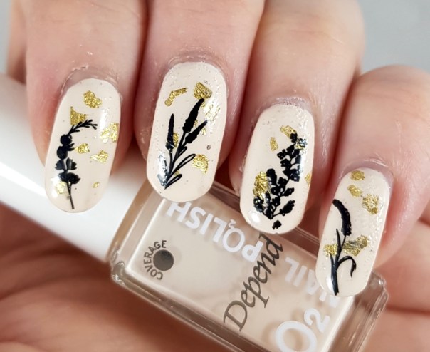 I applied some gold leaf while it was still wet and then stamped with Cuticula Licorice and the plate Geometric Flora from Lesly. I think it turned out ok. Rather elegant, but in hindsight I would probably have used less of the gold leaf.