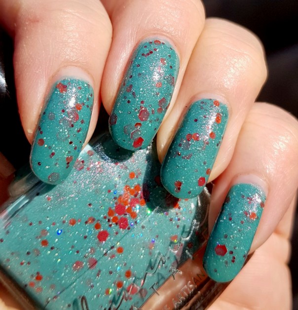 In English: Interstellar Bursts from Femme Fatale is a fun polish in a quite unique colour combination. The base is teal and it has a generous sprinkle of prismatic miniflakes and different sized red glitters. I liked it a lot!