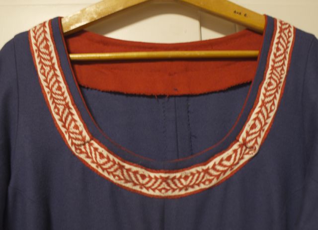 Manikyren gjordes för att matcha den här klänningen, som jag sydde till medeltidsveckan i somras. Den är inte helt historiskt korrekt, men jag satsade på att hålla mig rätt nära 1300-tal. Den är sydd i ett väldigt trevligt tunt vejdeblått ylle från Handelsgillet, och har långa hängärmar som är öppna från armbågen och fodrade med samma ylle i krapprött. Jag har kompletterat den med ett brickband i linne som jag vävt nyligen och sytt fast runt urringningen. Jag är rätt nöjd med den, faktiskt. Bifogar dels en bild på den som den ser ut nu, och dels en bild från medeltidsveckan då inte bandet fanns än (och då den hade hängt ut sig lite eftersom det var så varmt – den har krympt ihop lite sedan dess). Tycker bandet piffade upp den avsevärt. Sedan borde jag ju ha täckt håret om jag skulle ha varit lite mer historiskt korrekt, men jag hann inte sy något att ha på huvudet, så det fick bli en (vad jag tror är ganska korrekt) håruppsättning, istället. En så urgammal (med den tidens mått) kvinna som jag skulle nog aldrig ha visat sig utan något på huvudet då det begav sig… Jag borde också egentligen inte haft en färgad underklänning eftersom linne sällan färgades. (Och jo, nagellack är väl det minst historiskt korrekta av allt, men det finns gränser… Jag kan ju inte gå naken!) Det var kul att ta upp brickbandsvävningen igen också! Jag vävde en del brickband för sisådär en 15 år sedan, men slutade till förmån för något annat pyssel. Nu har jag blivit lite sugen igen!