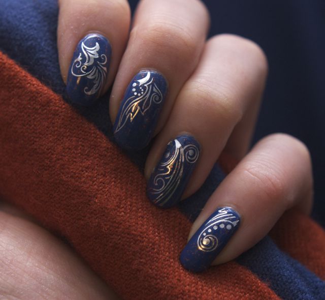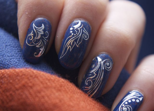 Äsch, nu får jag väl ta mig i kragen och få ut ett blogginlägg! Det har blivit lite knapert med det på sistone. Jag fotar mammas kattungar (kolla in mig på Instagram, jag heter Nageldraken även där, om ni vill se mer bilder på kattungar och Katla) och lägger upp dem på hennes hemsida, och det har tagit en stor del av min datortid på sistone. Nåväl, den här manikyren hade jag för några veckor sedan och var riktigt nöjd med den. Det är något så ovanligt som ett återanvändande av ett jättegammalt lack! Jag har visat det förr, men det var 2010, strax efter att jag startade bloggen, så det är kanske nytt för många av er ändå. Då tyckte jag att hållbarheten inte var särskilt bra, men det märkte jag inte av nu. Jag hade det dessutom på fest, vilket av någon anledning alltid brukar döda mina manikyrer, men jag fick ändå bara lite tipwear efter ett dygn. Jag bar tre lager, men två hade nog räckt egentligen. Det är ett fint, lite dämpat blått med kopparfärgat smått glitter. Det är riktigt läckert, och helt unikt i min samling. Det var dessutom bra att applicera, så jag har inget att klaga på!