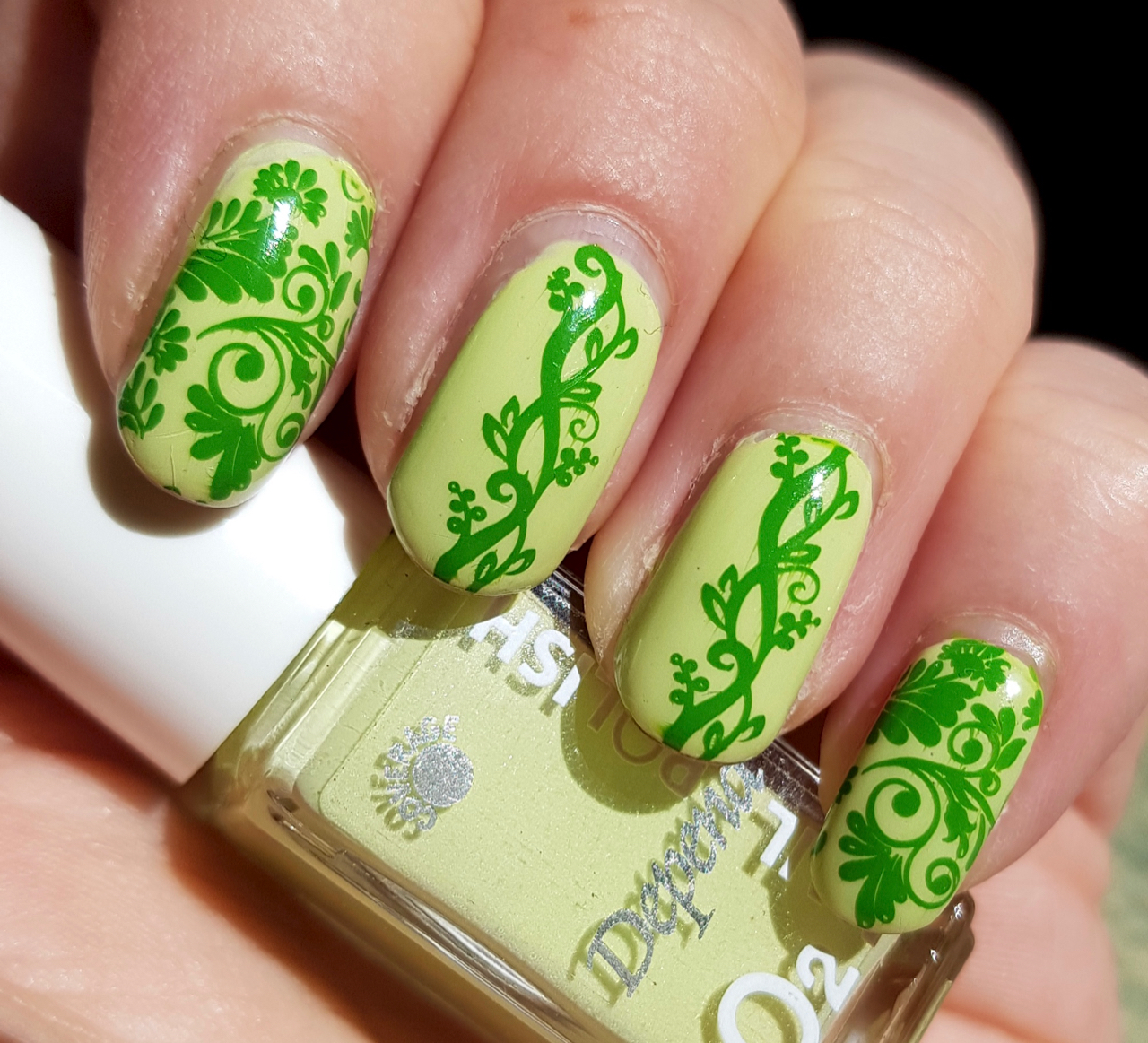 Jag stämplade med ett grönt lack från Beauty Big Bang och använde plattan Lesly Ornate. Äntligen funkade stämplingen igen! Jag vet inte riktigt vad som har strulat, men jag har inte fått till stämplingen på ganska länge. En fundering jag har haft är att det har att göra med den torra luften under vintern, men det kan också vara jag som tappade tekniken ett tag.