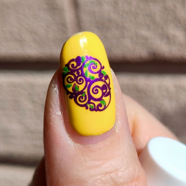 Årets påskigaste manikyr blev en kycklinggul bas (Depend 764, pressprov från Street Smartkollektionen) med stämpling i lila och grönt. Jag hade tre lager, och det var lite bökigt att applicera, som gula krämlack ofta är, men inte omöjligt. Jag använde ett lila och ett gräsgrönt stämplingslack från Beauty Big Bang och Hit the Bottle Emeralds are Forever samt stämplingsplattan Victorian Easter från Clear Jelly Stamper.