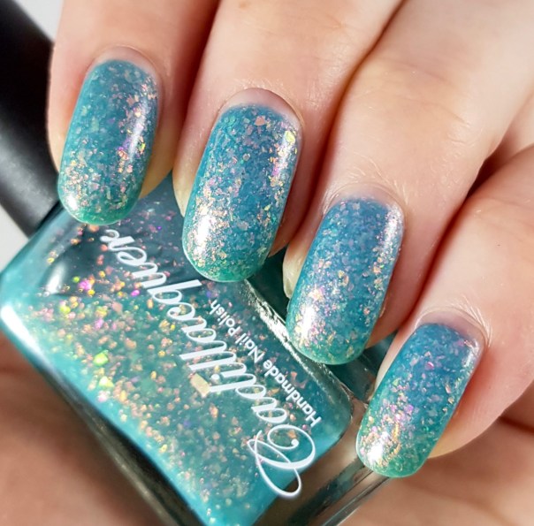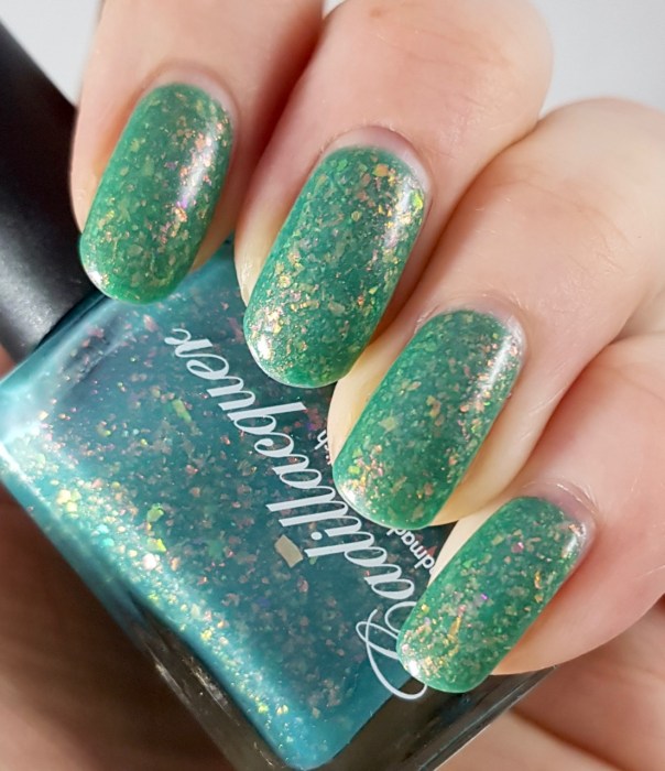 En del termolack är mer termo än andra. Det här är inte ett av dem, utan det här är ett sånt där som man måste titta ganska noga på för att se skillnaden. Enligt beskrivningen ska det vara gräsgrönt när det är kallt och ljusblått när det är varmt, men min flaska blev bara lite mer grönblå när den var kall. Det kan vara så att den har fått stå lite för länge och tappat effekten. Det är snyggt i vilket fall, även om det hade varit kul med en tydligare termoeffekt. Det har iridicerande flakies i rosa/guld/orange samt rött/orange/grönt och ser squishigt och härligt ut! Ganska skirt, men täckte på tre lager. Det var aningens tjockt att lacka med, men inte så det störde.