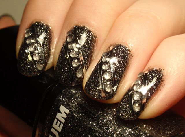 Dekoren består av billiga strasstenar från eBay och striping tape i silver från Trans Design. De billiga strasstenarna är inte lika fina som de dyrare man kan köpa på annat håll, men ska man använda så här många är de bra att ha.