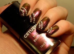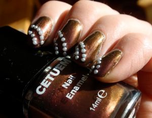 Cetuemlacken blev ganska dissade när de var på Nailmail i höstas, och någon toppenformula har de jag har provat inte haft, men inte usel heller. Lite åt det rinniga hållet, men hanterbara. Det här lacket var också lite rinnigt, men det täckte på tre lager och blev faktiskt väldigt fint. Det är ett av de mest duokroma lacken jag har. Grundfärgen är lilarosa, men det skiftar tydligt i brun-guld-grönt, även i svagare inomhusljus. Jag gillade det!