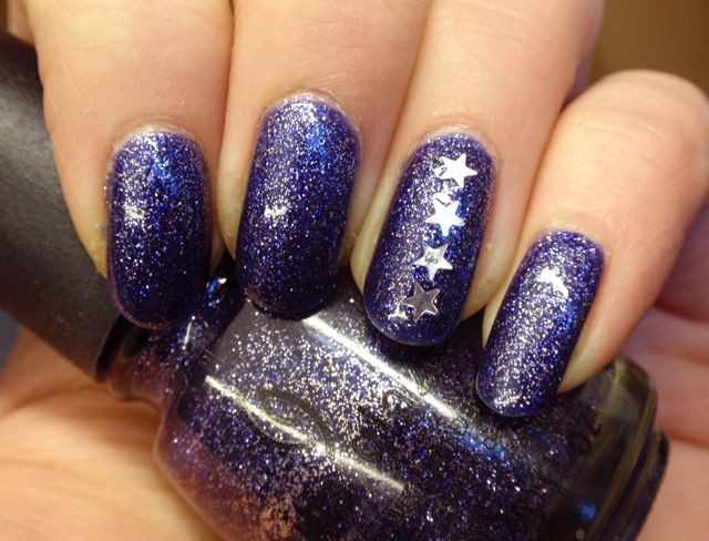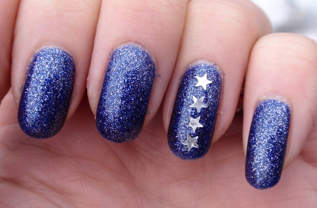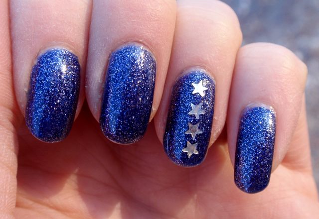 This polish were left untested way too long – it is a beautifyl polish but it is nicer on the nails than in the bottle. It took three coats to be opaque, but only one coat of Seche Vite to smooth it out. It was tricky to photograph. It is a very purple toned blue, and it looks bluer in my pictures than it really was. I decorated it with a simple row of star sequins.