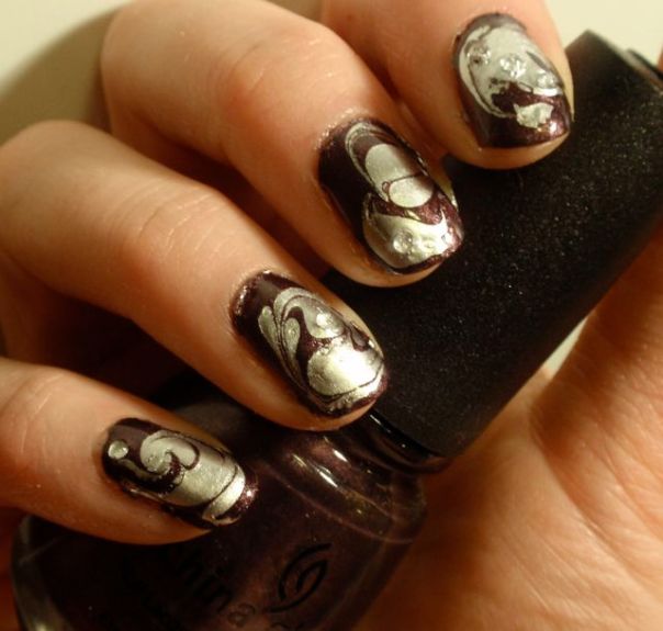 Nästa försök att marmorera. I det här använde jag China Glaze Bogie som grund och marmorerade med China Glaze Millennium, vilket inte var en bra ide. Millennium är ju ett kromlack och torkar jättefort, vilket gjorde att det var väldigt svårt att dra runt i Bogie. Det blev liksom en torr klick i det våta baslacket. Inte så bra. Det blev ok ändå, men inte som jag hade tänkt. Jag klämde också dit lite strasstenar för att pigga upp det en aning. Det är lite kul med marmorering i alla fall. Det går himla fort att göra och blir ändå rätt fint.