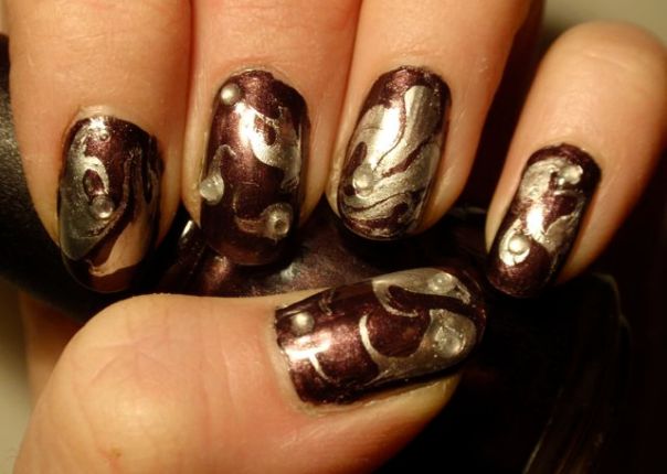 Dekoren är målad på fri hand med nail art-lack i svart och silverglitter och så tryckte jag i några strasstenar. Det blev väl ok, men lite för oregelbundet för att jag ska vara helt nöjd.