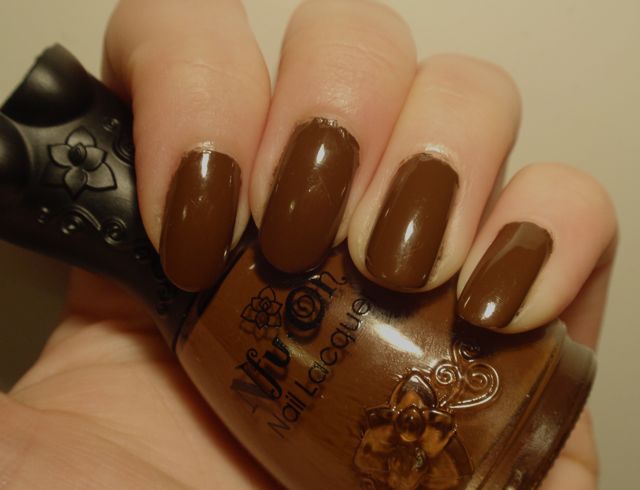 Formulan fick mig också att tänka på choklad, faktiskt. Den var liksom väldigt krämig, så det kändes nästan som att måla naglarna med smält choklad. Jag tyckte den var väldigt trevlig, med undantaget att det rann en hel del längs det långa skaftet på borsten och droppade på sidan av. Nu har jag alltid ett papper under när jag målar naglarna, så det var ju ingen katastrof, men lite irriterande var det allt.