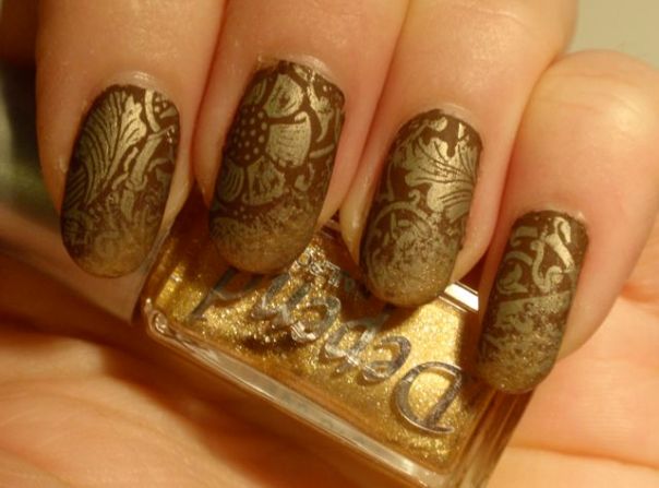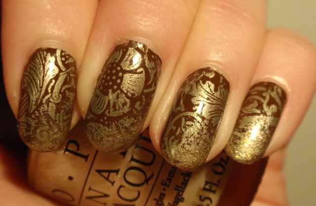 To stop myself from nibbling my fingers in a fit of acute chocolate cravings, I covered it in decorations. I sponged a corner with the pale gold OPI I Only Drink Champagne first, followed by a little of the warmer golden Depend 118. Then I added a pale gold lace nail art foil over it all. I was not completely happy with it this way, though, so I put on a coat of China Glaze Matte Magic to give it a more antique look. I liked it much better this way, though it still reminded me of chocolate – but of expensive pralines instead… 🙂 It got to stay on for five days, and it actually could have stayed on longer if I had not been impatient to try something new. There were no chips at all on day five, and not too bad tip wear either.