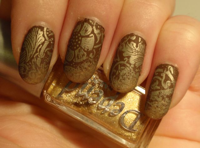 För att undvika att jag skulle tugga på mina naglar av akut chokladsug så smällde jag på lite dekor också. Jag svampade ena hörnet med blekt guldiga OPI I Only Drink Champagne först och sedan lite av det mer guldiga Depend 118 eftersom jag tyckte det blev lite för blekt. Därefter lade jag på en blekt guldig spetsmönstrad folie.