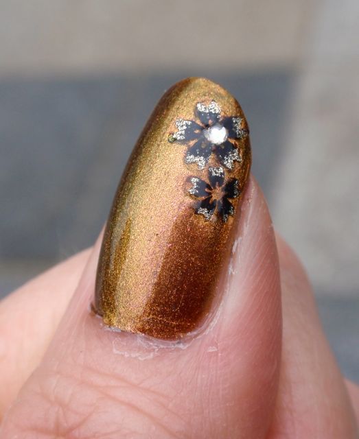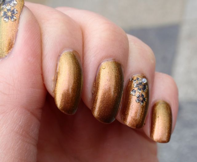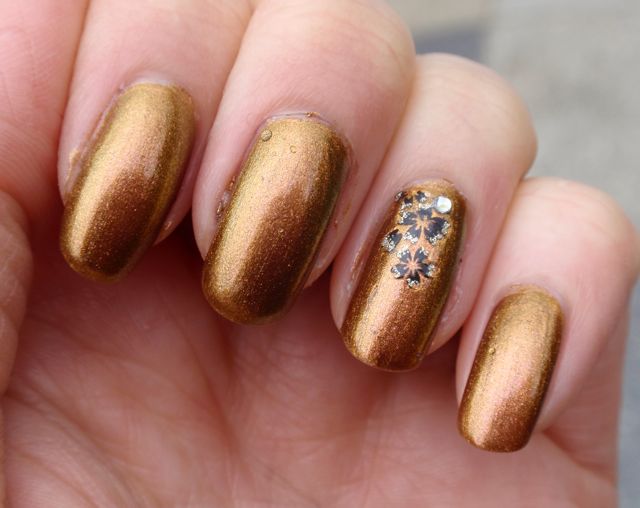 I wore three coats and it was a bit difficult to get the layers even, and it was a bit runny. I decorated it with gold leaf that I tore into small pieces and pressed down into the polish while it was still wet. It was a little fiddly, but really not difficult.