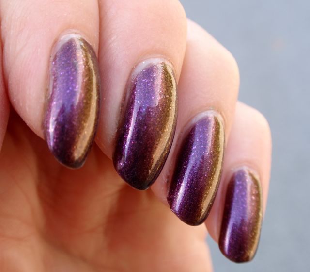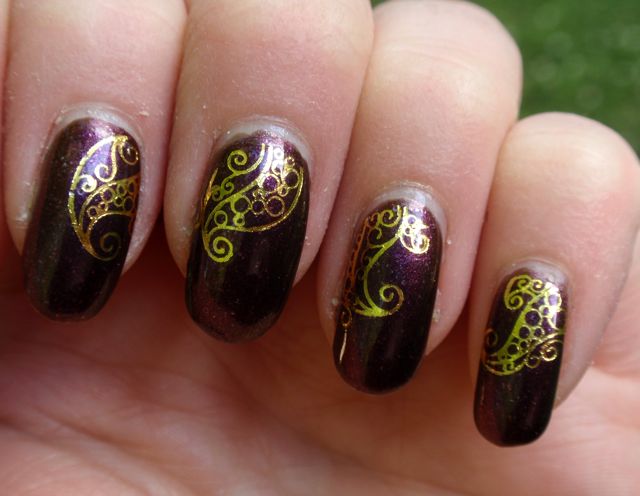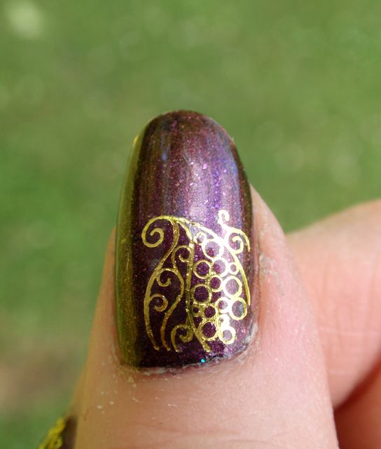 Another one from the archive. Maia is from the Pleiades collection, which consists of some beautiful multichromes. This one is mostly purple but shifts to gold and maybe a little green. I wore three coats and it was pretty easy to apply. The water decals are from Adnails.