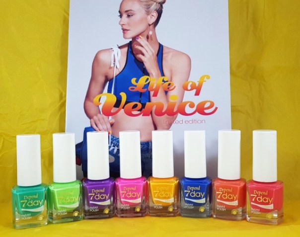 Häromdagen damp Depends sommarkollektion Life of Venice till min stora glädje ner i min brevlåda. Den är väldigt färgglad och passar verkligen perfekt till sommaren! Kollektionen ges ut i begränsad upplaga (och jag misstänker att de kan gå åt rätt fort) och består av åtta krämlack i 7 days-serien. Jag har sett att en del har skrivit att de är neoner, men de torkar inte matt, så de är inte ”äkta” neoner om man ska vara petig.