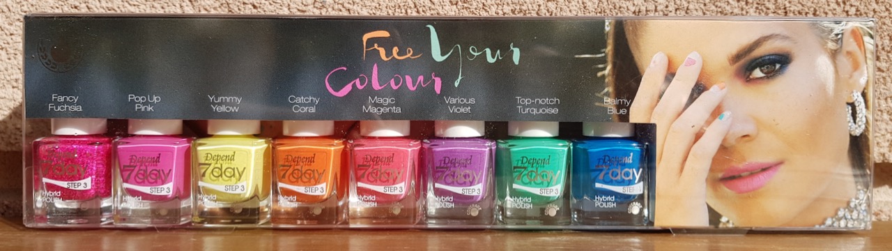 Free Your Colour är från Depends 7 day-serie och ges ut i begränsad upplaga. De kostar 49 kr styck och finns i butik sedan länge vid det här laget… Jag har fått dem som pressprover. Kollektionen består av sju färgglada krämlack och ett rosa glitter i klar bas. Lite för mycket rosa för min smak, men jag gillar alla lack i kollektionen som inte är rosa! 🙂