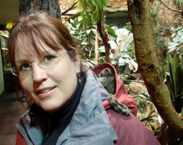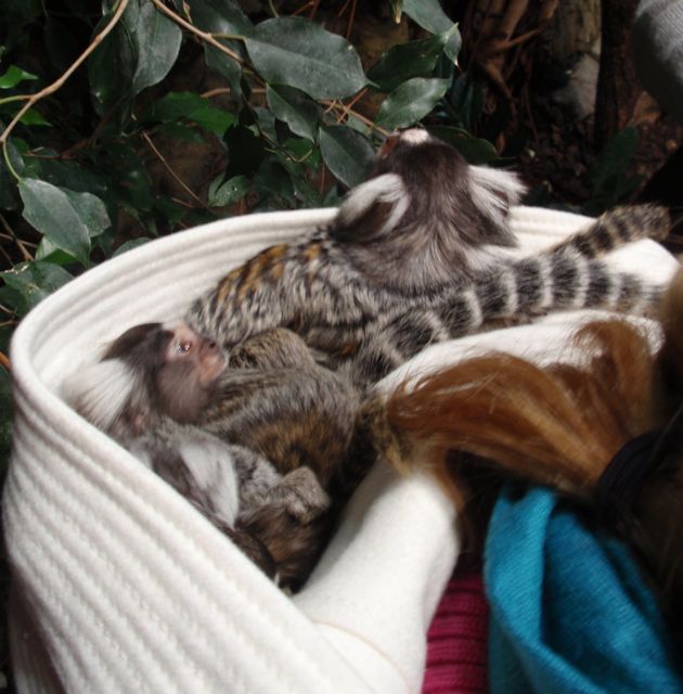 Sedan gick vi förbi silkesapornas djungel, och eftersom det var så lite folk var de jättenyfikna och närgångna. Det stod att man inte fick röra djuren, men så fort vi stod stilla blev vi översvämmade av supersöta apor, så det var liksom svårt att låta bli. Tre av dem bosatte sig i min huva och ville inte alls flytta sig därfrån!
