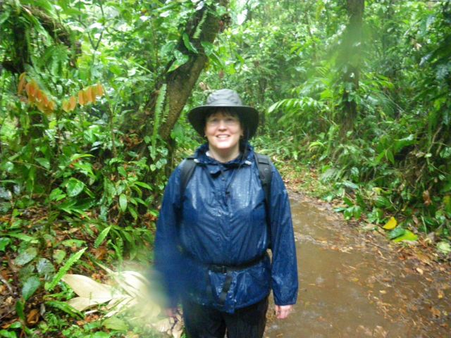 Och så här blöt blir man av att hamna i ett tropiskt regnväder. Fast det var ganska kul! Jag hade ju regnkläder och hatt och det var ju inte det minsta kallt. Dessutom fick jag roa mig med att iaktta väldigt blöta amerikaner som hade gått på promenad i regnskogen utan regnkläder. Ja, jag är lite elak, men det var faktiskt lite roligt…. 😉 Dessutom var regnet väldigt dramatiskt och imponerande! Det verkligen studsade upp från marken!