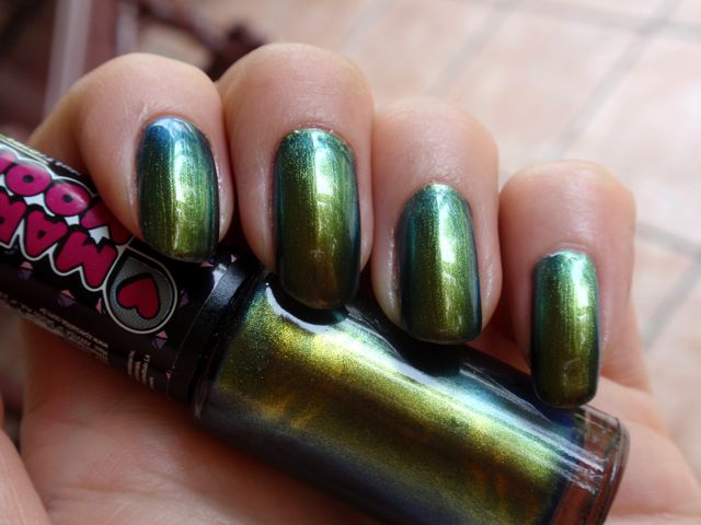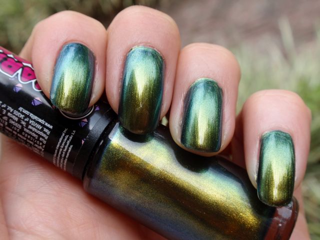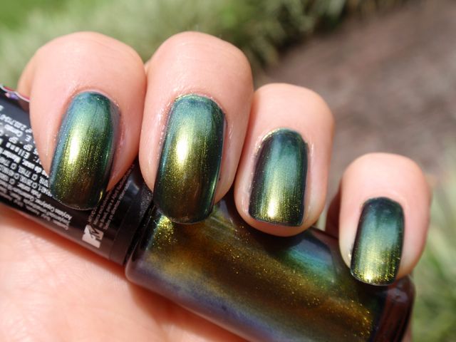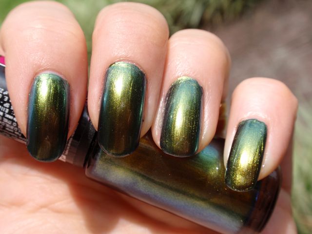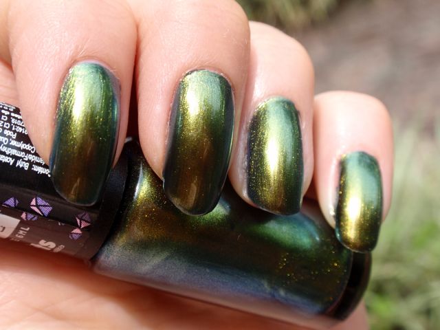 Jag hade i alla fall tre lager och formulan var väl normal. Har för mig att den var lite svårkontrollerad, men inte farligt. Det är ett väldigt tjusigt multikromatiskt lack som skiftar tydligt mellan guld, grönt och blått. Det är lite likt Ozotic 507, men grönare och med en betydligt tydligare blå skiftning. Det klarar sig också bra på egen hand och behöver inte läggas över ett svart krämlack.