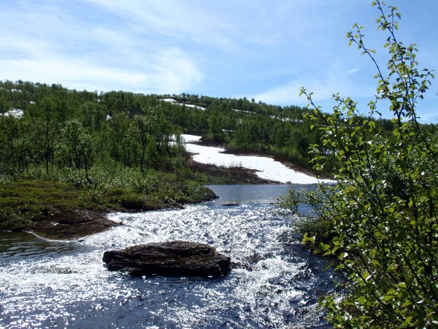 Nu har jag varit en dålig bloggare igen, förlåt! Det har blivit mycket resor på sistone, men nu ska jag nog hålla mig hemma ett tag framöver. Jag har precis kommit hem från vår årliga fjällvandring, eller fiskeresa, det beror väl på hur man ser det. Fisket är viktigast, men man brukar få gå en bra bit för att komma till de bra vattnen. Det var riktigt fint! Det regnade tydligen hela tiden i Uppsala när vi var borta, men vi hade bara en regnig dag, annars bara småskvätte det. Och vi hade några riktiga kanondagar med strålande sol. Sommaren var sen i fjällen i år däremot, så det var jättemycket snö kvar och myggen kläcktes inte förrän tredje dagen vi var uppe.